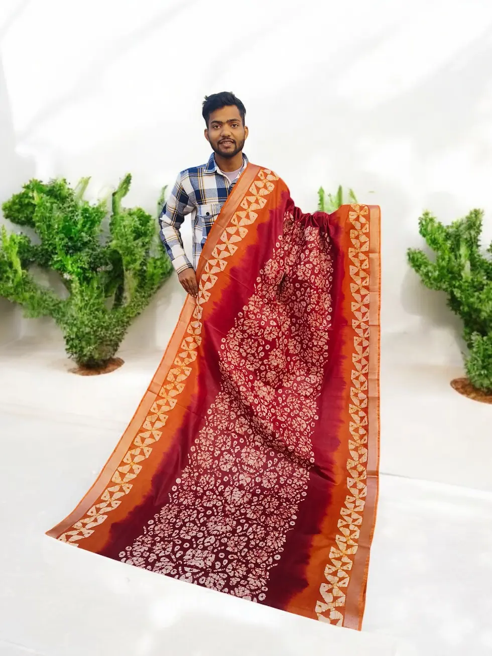Batik Print Linen Saree | Coca & Red