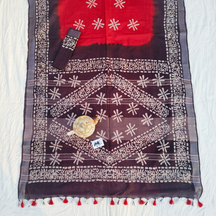 Batik Print Linen Saree | Coca & Red