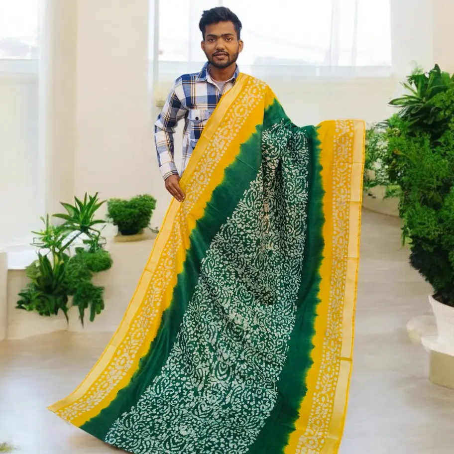 Batik Print Linen Saree | Yellow Green